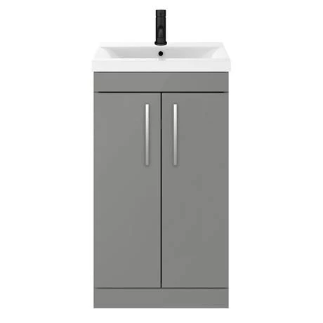The contemporary matt grey Arezzo furniture range, with it’s clean lines this vanity unit is perfect for renewing the style in any bathroom. It’s stylish modern design hides all unsightly pipework creating a neat modern look. A internal shelf provides generous storage space for your toiletries, helping to keep your bathroom clutter free. Features eye-catching and stylish matt grey finish with on-trend modern polished chrome square bar handles.
