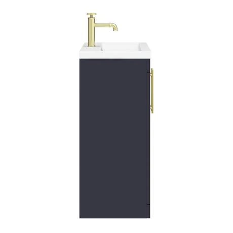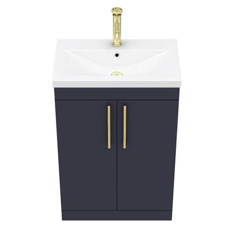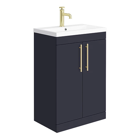 The contemporary matt blue Arezzo Industrial style furniture range, with it’s simple design this vanity unit is perfect for renewing the style in any bathroom. It’s stylish modern design hides all unsightly pipework creating a neat modern look. The units soft-closing doors provides plenty of storage space for toiletries. Features an eye-catching and stylish matt blue finish with on-trend round brushed brass knurled detail handles, great for creating an eye catching industrial look in your bathroom. Supplied with a quality 1 tap hole rectangular mid-edge ceramic sink.