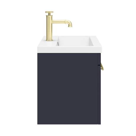The contemporary matt blue Arezzo Industrial style furniture range, with it’s clean lines this vanity unit is perfect for renewing the style in any bathroom. It’s stylish modern design hides all unsightly pipework creating a neat modern look. The units soft-closing drawer provides plenty of storage space for toiletries. Features an eye-catching and stylish matt blue finish with a on-trend round brushed brass knurled detail handle, great for creating an eye catching industrial look in your bathroom.