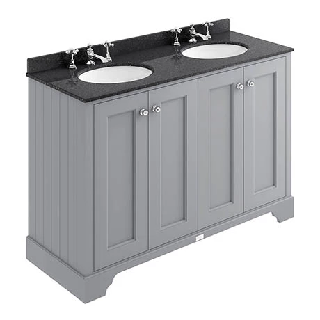 The Bayswater Plummett Grey 1200mm 4 Door Vanity Unit and Black Marble Double Bowl Basin Top will create a unique centre piece to any classic themed bathroom. It’s ample storage space provides plenty of room for bathroom essentials while the soft close doors limits the daily wear and tear and provides a quieter closing action. Made from high quality materials, it features side panelling for a classic look, elegant chrome knobs and a Bayswater logo plate that beautifully finishes the unit. The stunning black marble double bowl basin top contrasts beautifully with the classic white china basin.