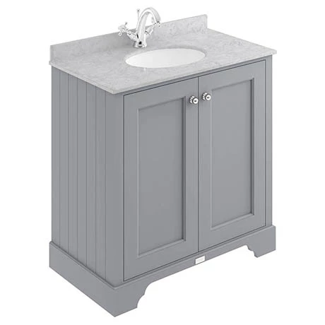 The Bayswater Plummett Grey 800mm 2 Door Vanity Unit and Grey Marble Basin Top will create a unique centre piece to any classic themed bathroom. It’s ample storage space provides plenty of room for bathroom essentials while the soft close doors limits the daily wear and tear and provides a quieter closing action. Made from high quality materials, it features side panelling for a classic look, elegant chrome knobs and a Bayswater logo plate that beautifully finishes the unit. The stunning grey marble top basin co-ordinates beautifully with the classic white china basin.