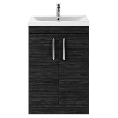 This Brooklyn Black Vanity Unit is a practical piece that’s also pleasing to the eye. Crafted from moisture resistant melamine faced chipboard in a woodgrain texture, it comes in Black for a statement look. At 610mm wide, this freestanding vanity unit offers plenty of room for storing bathroom essentials, keeping surfaces neat and tidy. The mid edged basin in white gloss ceramic makes a striking contrast with the black vanity unit. Matt chrome strap handles complete the modern design and the two soft closing doors prevent slamming. This unit even comes ready assembled for quick and easy installation.