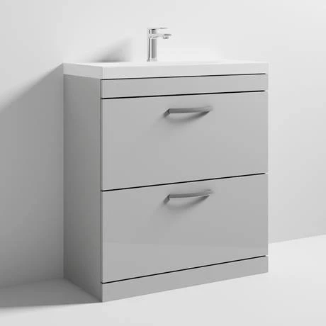 The Brooklyn modular furniture range combines up to date looks with practical storage. This 800mm floor standing vanity unit features 2 soft close drawers which provide plenty of storage space for toiletries, the Brooklyn vanity unit is perfect for adding modern style to any bathroom. This high quality gloss light grey vanity unit is supplied with a sleek gloss white thin-edge ceramic basin and quality matt chrome handles.ย