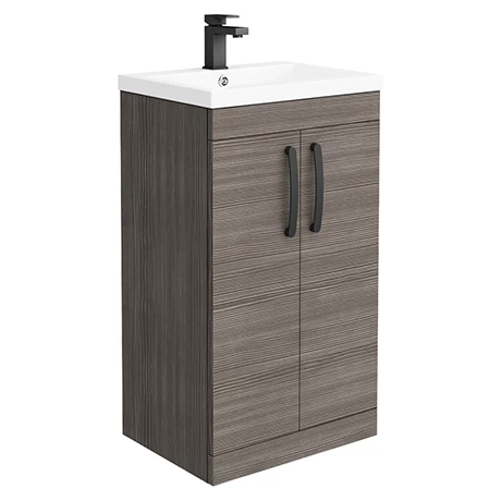 The Brooklyn grey brown avola modular furniture range combines up to date looks with practical storage. Features two soft close doors and provides plenty of storage space for toiletries, the Brooklyn 500mm wide floor standing vanity unit is perfect for adding modern style to any bathroom. This high quality grey avola textured wood effect vanity unit is supplied with a smooth white gloss vitreous china basin. All units are provided with quality matt black handles.