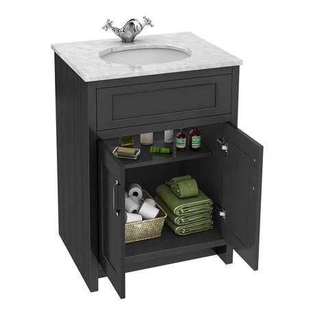 The Chatsworth traditional 610mm wide graphite vanity unit with marble basin top, Victorian inspired design with a modern twist. The Chatsworth range of charming bathroom furniture features classic styling with a satin graphite finish cabinet and tongue-and-groove side panelling.