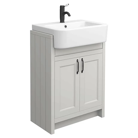 The eye-catching Chatsworth traditional 600mm wide grey vanity unit with a gloss white semi-recessed basin and eye catching matt black handles, Victorian inspired design with a modern twist. The Chatsworth range of charming bathroom furniture features classic styling with a satin grey finish cabinet and tongue-and-groove side panelling. The semi recessed basin will half sit in your unit.ย