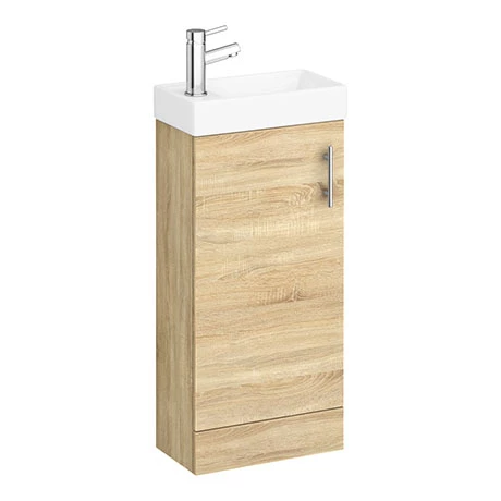 A elegant natural oak effect compact floor standing vanity unit, perfect for cloakrooms or en-suites. This quality vanity unit comes with a contemporary chrome handle and provides practical storage. Unit has a soft close door which limits the daily wear and tear and provides a quieter closing action.
