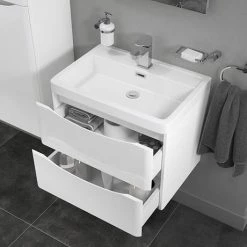 The London collection offers classic beauty with clean lines. This smooth white painted 60 Wall Hung Two Door Vanity Unit with Ceramic Basin features soft closing doors with an an internal adjustable wooden shelf. This unit also comprises of a single tap hole rectangular ceramic basin and a pair of stylish chrome handles. Fitted with mounting rails and brackets for adjustable and quick installation.