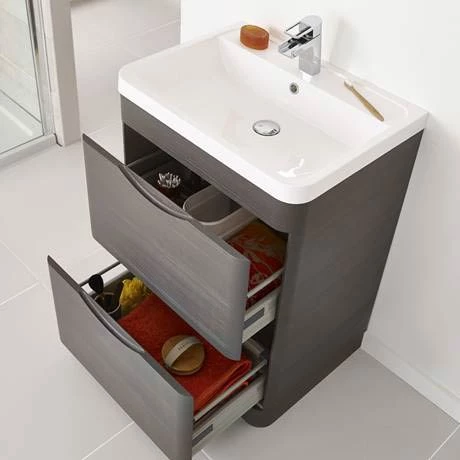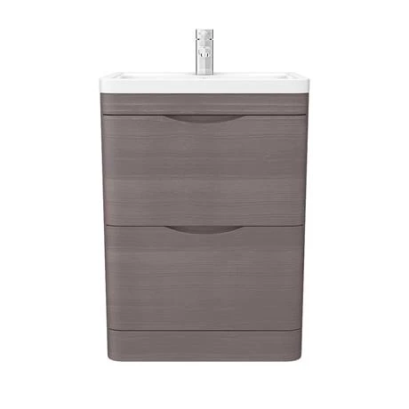The modern Monza wood effect stone grey floor standing vanity unit includes a stylish 600mm wide poly marble basin, features soft lines and gentle curves with 2 large functional soft closing drawers providing plenty of storage space.