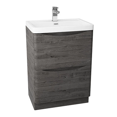 A minimalist design combines with maximum storage in the Monza Graphite Oak Vanity Unit. This 600mm wide, floor standing vanity unit has two generously proportioned soft closing drawers for storing your bathroom essentials. The freestanding vanity unit is topped with a contrasting white gloss basin in durable polymarble – easy to wipe clean for long lasting sparkle. If you love this Graphite Oak vanity unit, you might appreciate the matching Graphite Oak Monza Tall Storage Unit for even more cupboard space.