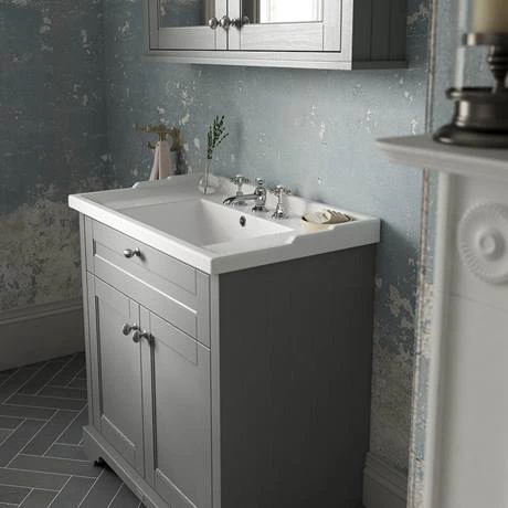 Add a cool touch of colour to your bathroom with this Storm Grey 2-door cabinet and basin. It features soft close doors which limits the daily wear and tear and provides a quieter closing action. Ideal for creating a period look in your bathroom this furniture range with it’s clean classical design blends beautifully with Old London’s range of traditional bathroom furniture.