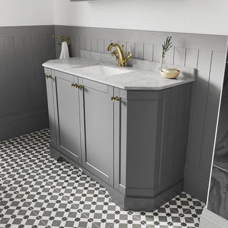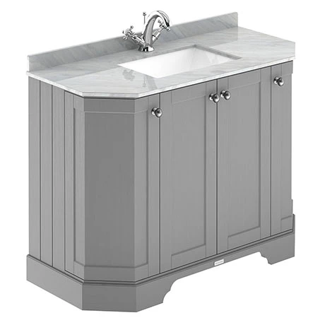 Old London furniture is the epitome of traditional design. This Art Deco styled Storm Grey 1000mm Angled Cabinet features soft close doors which limits the daily wear and tear and provides a quieter closing action. The luxury Grey polished marble top achieves a timeless, classic look. This art deco vanity unit is ideal for creating a period look in your bathroom, withย it’s clean classical design blending beautifully with Old London’s range of traditional bathroom furniture.