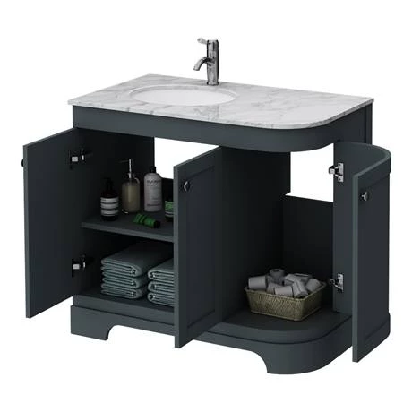 The Period Bathroom Company traditional 920mm wide dark grey coloured offset curved vanity unit with white marble basin top; Victorian inspired design with a modern twist. The Period Bathroom Company range of charming bathroom furniture features a satin finish with clean lines and a recessed center panels for a classic look.
