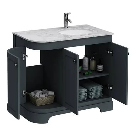 The Period Bathroom Company traditional 920mm wide dark grey coloured offset curved vanity unit with white marble basin top; Victorian inspired design with a modern twist. The Period Bathroom Company range of charming bathroom furniture features a satin finish with clean lines and a recessed center panels for a classic look.