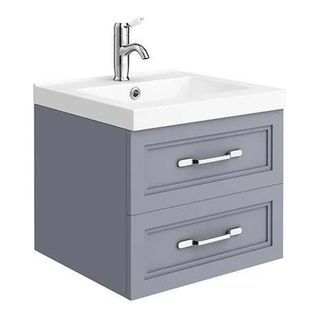 Provide a beautiful finishing touch in your bathroom with the Period Bathroom Company traditional 500mm compact 2 drawer wall hung satin grey vanity unit with gloss white basin top. Victorian inspired design with a modern twist, a great alternative to the basin and pedestal, The Period Bathroom Company’s range of charming wall hung bathroom furniture features classic styling with a satin finish cabinet and a traditional polished chrome strap design handle. The 2 soft-close drawers eliminates slams and provides generous storage space for your toiletries, helping to keep your bathroom clutter free.ย