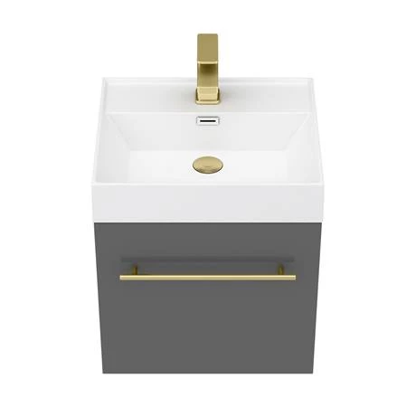 The stylish Valencia 450mm compact vanity unit, features a durable gloss grey cabinet with brushed brass handle and a modern thin edged white gloss polymarble basin. Add innovative sleek design to your bathroom with the minimalist Valencia furniture range, ideal for making a statement in any modern bathroom.ย